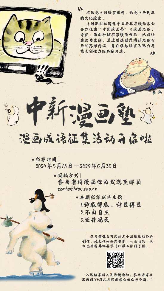 成語是中國語言精粹,也是中華民族的文化瑰寶。熟知每一個成語,不僅可以培養(yǎng)語言能力,也有助于加深對傳統(tǒng)文化的理解。即日起,中國新聞社海外中心與北京漫畫學(xué)會合作推出“中新漫畫塾”《漫畫成語》專欄,現(xiàn)面向全球征集漫畫作品。