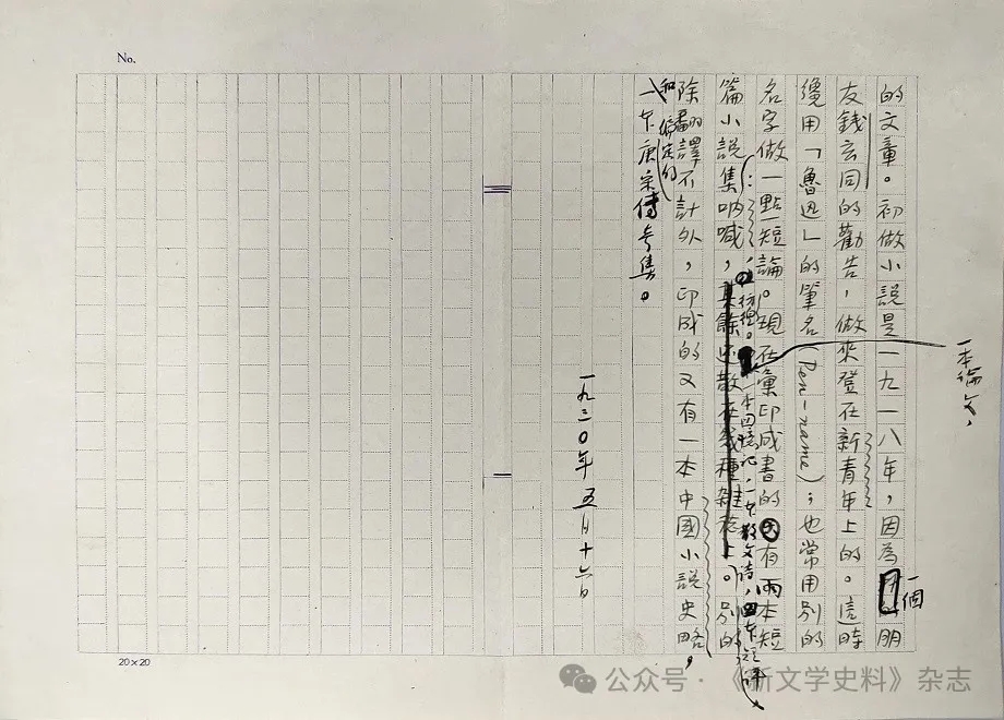 不同于用于再編的、經(jīng)過修改謄寫的《南腔北調(diào)集·〈自選集〉自序》手稿,“魯迅手稿補遺一頁”是用于初次刊印的,寫作時間應即《南腔北調(diào)集·〈自選集〉自序》文末所記“一九三二年十二月十四日”。筆者翻查了此日前、后數(shù)年的魯迅文稿,檢出由柔石錄寫、魯迅題名并作改的《魯迅自傳》手稿⑥,所用稿紙和“魯迅手稿補遺一頁”相似度較高,頁面布局、紋路細節(jié)基本一致。此種《魯迅自傳》稿共三頁,一列二十格,共二十列,格線淡紫色;稿紙高19.4cm,寬27cm,頁眉左端印“NO.”,頁腳左端印“20×20”。此稿第三頁只占用了右半頁,左半為空白稿紙,為便于比較觀覽,錄末頁圖版于此,見上圖。