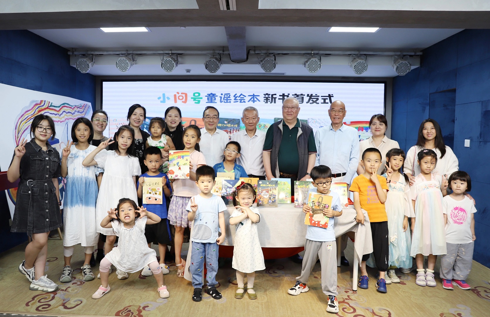 鄔書林、高洪波、郭義強、海飛、陳暉、納楊、林云一起為“小問號童謠繪本”新書揭幕,并和現場的小朋友們一起合影。