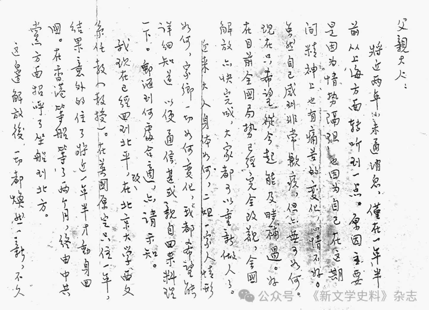 接到父親辭世的噩耗,十分悲慟。春節(jié)前接到祖輝來信,報(bào)告父親病狀,當(dāng)時(shí)我的感情實(shí)在波動得更厲害一點(diǎn),因?yàn)槲抑雷约簺]有法子見到他了,所以寫那封信我實(shí)際上已經(jīng)當(dāng)作告別信而寫了,幸而信能在父親臨終前趕到,使我稍感到一點(diǎn)寬慰。兩個(gè)半月來學(xué)校里一直進(jìn)行著三反運(yùn)動,這在我們教員中主要是一個(gè)新舊思想斗爭的運(yùn)動,非常重要。我們西方語文系教員(包括英、德、法文三組的教授,副教授,講師,助教),除外國籍者以外,還有二三十人,都參加思想改造斗爭,我恰好又在代理系主任,責(zé)任重大,實(shí)在談不上回家省親或送喪。接到噩耗(祖輝的第二次信),我正日夜緊張,沒有就回信,想不到過了幾天自己也連發(fā)高燒,病倒了,終于進(jìn)醫(yī)院住了幾天,病還沒有完全好,因?yàn)榱碛行碌娜蝿?wù),只得提早出院。這次任務(wù)是應(yīng)印度文化界邀請,與另外二位,代表中國文化界,去印度出席他們的文化界和平大會 ,幾天內(nèi)就要動身了?,F(xiàn)在我一邊休養(yǎng),一邊準(zhǔn)備。此去大約需要一個(gè)月的時(shí)間。最近手頭窘極,幸而今天發(fā)薪,撥寄四十萬元,其中一部份即作還債用。我是拿人民的小米,如為了迷信而鋪張浪費(fèi),那就太對不住人民了!所以務(wù)請注意?,F(xiàn)在還不拋開那些無聊的封建迷信,那就實(shí)在不配作新時(shí)代的人民了!其余債務(wù),我當(dāng)負(fù)責(zé)于幾個(gè)月內(nèi)設(shè)法還清(我住醫(yī)院的錢也只能從月薪里絡(luò)續(xù)扣還),請代為謝謝親鄰的幫助。下月份匯錢,可能要晚幾天,因?yàn)樾枰任一貒呸k。