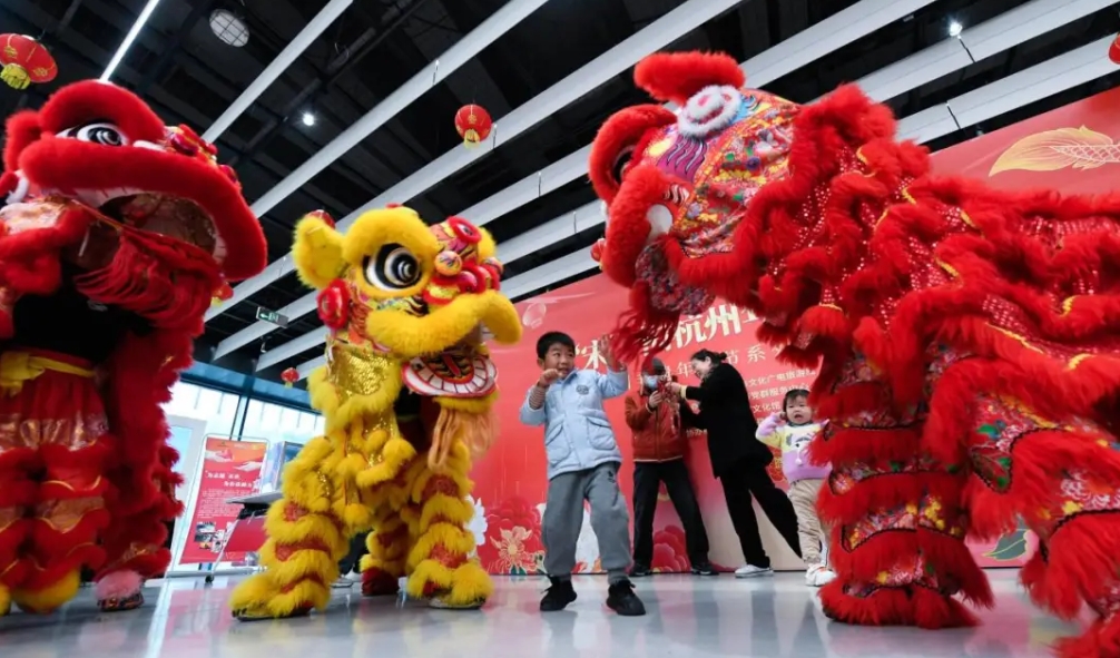 小朋友在杭州非遺年貨節(jié)現(xiàn)場(chǎng)與傳統(tǒng)舞獅表演互動(dòng)。