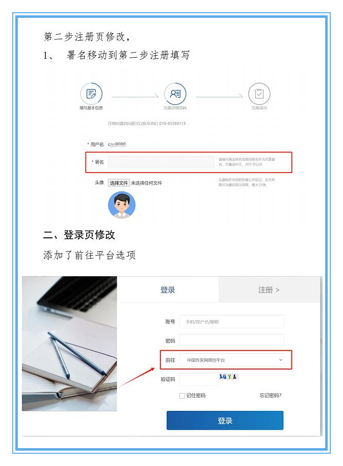 我們將于7月22日上線中國作協(xié)會(huì)員注冊(cè)系統(tǒng),屆時(shí)原創(chuàng)平臺(tái)注冊(cè)和登錄頁面信息顯示會(huì)發(fā)生個(gè)別變化,但對(duì)注冊(cè)及登錄使用不發(fā)生影響。我們以圖片示例形式(見下圖一、二、三、四)將頁面變化公告如下,請(qǐng)知悉。