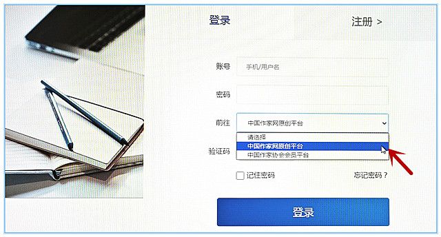 圖三(特別提醒:登錄頁新增的“前往”選項(xiàng)中,原創(chuàng)平臺(tái)用戶一定要點(diǎn)選下拉菜單中“中國作家網(wǎng)原創(chuàng)平臺(tái)”,才能正常登錄對(duì)應(yīng)平臺(tái),注意切勿誤選“中國作家協(xié)會(huì)會(huì)員平臺(tái)”)
