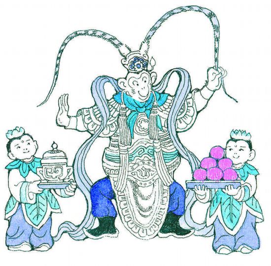 其次,此書堅(jiān)守了原著的人文精神。原著最具文化普適性的主題是不畏艱難的取經(jīng)精神。兒童的身體和精神皆需成長,成長就是不斷克服困難的學(xué)習(xí)歷程?!皩W(xué)以成人”既是儒家的修身目標(biāo),也是取得真經(jīng)的隱喻。最初猴王在花果山上整天吃喝玩樂反生厭倦,故而魯兵把猴王離開花果山的起因界定為外出拜師學(xué)藝。離家是兒童成長的經(jīng)典姿態(tài),也是英雄成長的起點(diǎn)。猴王陷入困境、離家歷險(xiǎn)、愿望滿足、重返家鄉(xiāng)的敘事模式便是兒童將要經(jīng)歷的人生之路的象征,而且也是中華民族自強(qiáng)不息精神的完美體現(xiàn)。