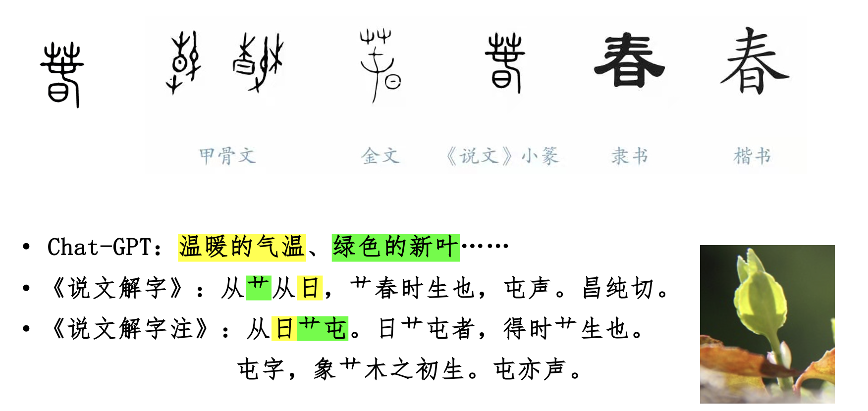 我們將古人的解讀與Chat-GPT 的回答相對(duì)照:“日”對(duì)應(yīng)于Chat-GPT所說(shuō)的“溫暖的氣溫”,“艸”和“屯”對(duì)應(yīng)于“綠色的新葉”(見(jiàn)圖一高亮色塊的對(duì)應(yīng)關(guān)系)。在“春”的甲骨文字形里,“艸”分解成了兩個(gè)“屮”,而“屯”幾乎就是植物萌芽(圖一右下方)的擬態(tài)。不難發(fā)現(xiàn),我們的祖先和AI大模型,雖然被漫長(zhǎng)的歷史和海量的網(wǎng)絡(luò)數(shù)據(jù)分隔在兩端,但在描述春天這件事情上是不謀而合的,這很浪漫,又很科學(xué)。在這個(gè)案例里,AI主要扮演了類(lèi)似于“智能助教”或“賽博對(duì)談?wù)摺钡慕巧?/p>