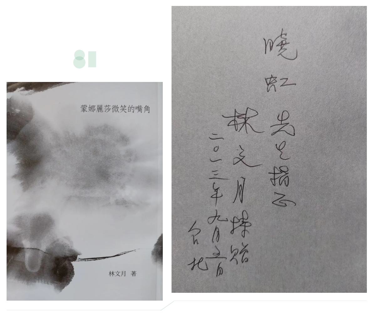 此次臺(tái)灣之行最大的收獲是,得到了林文月先生的簽名贈(zèng)書(shū)。這是她的一本文藝評(píng)論集,2009年由臺(tái)北有鹿文化公司出版的《蒙娜麗莎微笑的嘴角》。這個(gè)書(shū)名讓我聯(lián)想到林先生的笑容。書(shū)中收錄的近半文章,包括《擬古》,原先都是作為演講稿寫(xiě)作的。我在介紹各篇來(lái)歷的《自序》中,還是會(huì)看到“為我壯膽不少”“難免有些心悸”這類話。我不知道這是不是林先生生前編印的最后一本書(shū),我仍然從中窺見(jiàn)了林先生做得那么出色的教學(xué)和研究,也就是她的“正業(yè)”,可能并不是她喜歡的事,而創(chuàng)作和翻譯才是她的最愛(ài)。