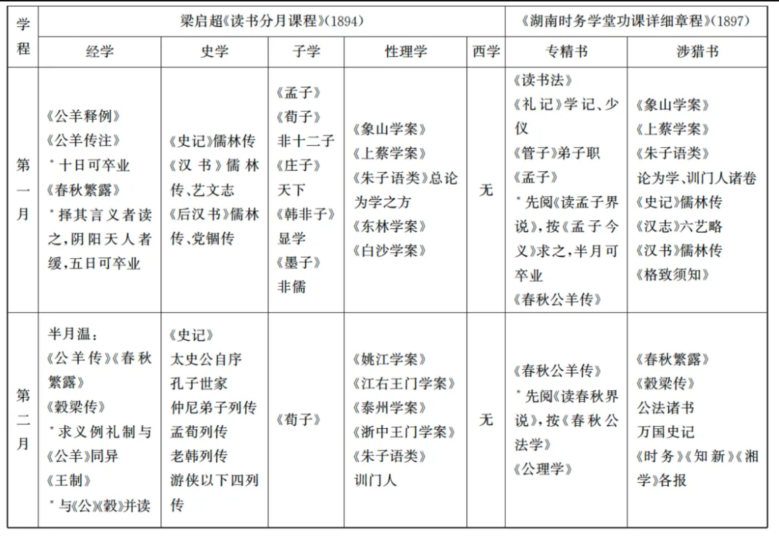 光緒二十四年三月,上海大同譯書局石印梁啟超輯《中西學(xué)門徑書七種》,收錄康有為《長興學(xué)記》、徐仁鑄《輶軒今語》、梁啟超《時務(wù)學(xué)堂學(xué)約(附“讀書分月課程表”)》《讀春秋界說》《讀孟子界說》《幼學(xué)通議》《西學(xué)書目表(附“讀西學(xué)書法”)》七種著作。除上述書目、條例兩類,《時務(wù)學(xué)堂學(xué)約》及所附“讀書分月課程表”的體例更接近傳統(tǒng)書院的學(xué)規(guī)。光緒二十年冬,梁啟超秉承康有為《桂學(xué)答問》宗旨作《讀書分月課程(附“讀書次第表”)》;三年后就任長沙時務(wù)學(xué)堂中文總教習(xí),又據(jù)之作《時務(wù)學(xué)堂功課詳細(xì)章程(附“第一年讀書分月課程表”)》,1898年代擬《大學(xué)堂章程》亦與這兩種“課程”有關(guān)。此類“課程”注重讀書進(jìn)度的安排,雖然也羅列書目,卻并不專注于類例、版本等目錄學(xué)信息,構(gòu)成康梁一派“門徑書”的第三個類型。