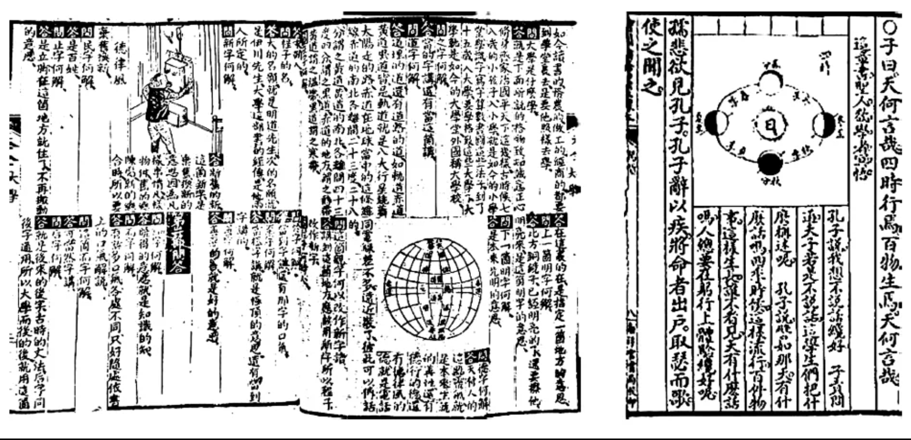 此外,彪蒙讀本還常在訓(xùn)解字義時牽扯與經(jīng)書原文毫不相關(guān)的新事物,僅憑字面雷同就將經(jīng)文附會于“外國政治藝學(xué)”,配以清末石印讀物中常見的“西洋景”圖像,堪稱近代經(jīng)訓(xùn)書中的一朵奇葩。如解“大學(xué)之道在明明德”,由“道”字講到“赤道”“黑道”“黃道”而配一赤道圖,又由“德”字聯(lián)想到“德律風(fēng)”(電話的舊譯)而配一打電話圖(如圖1左)。此外,如解“表里精粗”之“表”,則繪一寒暑表;訓(xùn)“忠信重祿”之“重”,則羅列重學(xué)試驗器皿;論“巧言令色”如留聲機(jī),則配一西人留聲機(jī)器圖——“諸如此類,觸目皆是”,引起保守者激烈反彈。該書先是被廣東提學(xué)使斥為“去圣之言不知幾千萬里”,旋又與彪蒙書室所出其他教科書一起遭到學(xué)部厲禁。盡管如此,直到光宣之際《繪圖四書速成新體讀本》仍頗盛行,據(jù)說“銷行二十余版,各地小學(xué)都采作課本”,坊間翻印本則多改題《四書問答》以避鋒芒。彪蒙書室亦迅速改竄原書,保留較為平實的白話譯文,模仿經(jīng)注體系于經(jīng)文句下,刪去較為激進(jìn)的“問答”部分,以《圖畫四書白話解》的新書名重出江湖,一直行銷至民國以后。