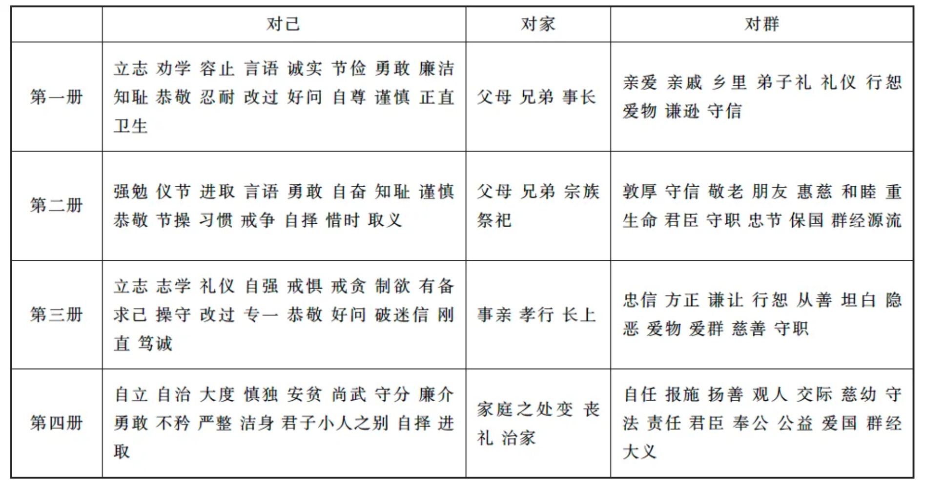真正憑借近代學(xué)科框架消解經(jīng)目秩序和經(jīng)文語境,且較有影響的經(jīng)學(xué)教科書,當(dāng)數(shù)光緒三十三年九月商務(wù)印書館初版《高等小學(xué)堂用經(jīng)訓(xùn)教科書》(以下簡稱《經(jīng)訓(xùn)教科書》)。該書由林萬里、黃展云、王永炘三人合編,共四冊,配合高等小學(xué)四學(xué)年。卷首《編輯大意》聲稱其書遵循光緒三十二年十一月十七日(1907年1月1日)諭旨“發(fā)明經(jīng)傳有益身心之言匯為一編”的要求,“略仿朱子《小學(xué)》體例,采取古人嘉言懿行以為學(xué)生模范;唯所引用者,概以群經(jīng)為斷,故定名為經(jīng)訓(xùn)教科書”。這套教科書曾一度被設(shè)定為讀經(jīng)科用書,卻并不遵循癸卯學(xué)制按經(jīng)目次序逐一講讀的要求?!毒庉嫶笠狻酚衷疲骸氨緯鲀跃磳?、對家、對群三大綱,分為三編,而將各課德目依類編次?!薄皩骸薄皩摇薄皩θ骸钡摹靶氯V”取代了君臣、父子、夫婦的舊三綱,成為整套教科書的骨架。在三者之下,再區(qū)分若干“德目”為各課,取自各經(jīng)的經(jīng)文片段被安排在這些德目之中,成為道德說教的材料。各冊德目分配大致如下表: