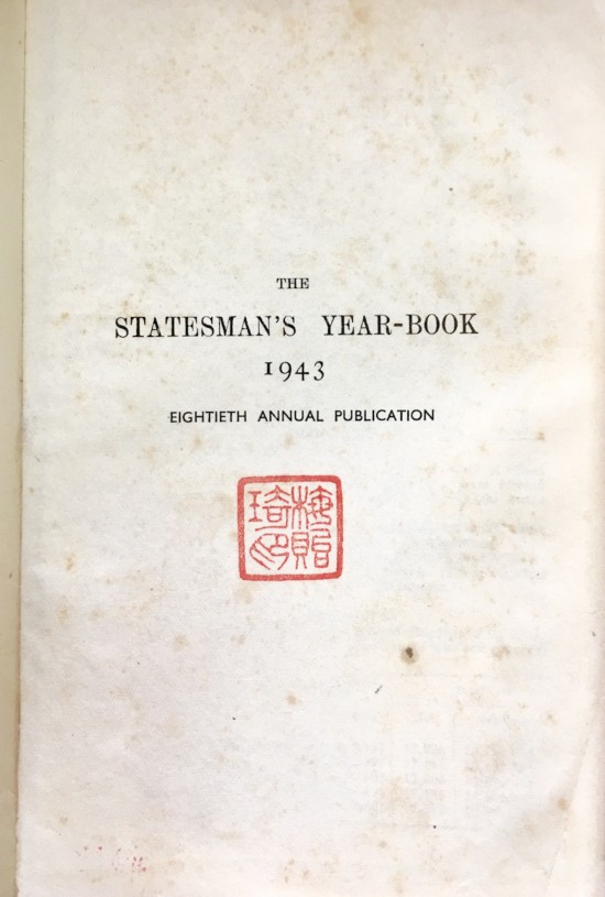 2024年4月,我買到一冊殘破的英文舊書《1943年度政治家年鑒》(The Statesman's Year-book 1943),書名頁鈐朱文篆印“梅貽琦印”?!墩渭夷觇b》是英國歷史最悠久的政經(jīng)年鑒,始創(chuàng)于1864年,到今天仍在持續(xù)出版。1943年度的,為該年鑒第八十次刊行。《政治家年鑒》一般在當(dāng)年年初面世,而所載信息更新相當(dāng)及時,如《1943年度政治家年鑒》有關(guān)中國部分,當(dāng)時國民政府的部長名單,更新至1942年12月7日。全書厚達(dá)一千四百多頁,能維持這樣的更新速度,編纂能力是驚人的。這樣一部工具書,當(dāng)然是供人查閱,而非展讀的。不過,梅貽琦既鄭重鈐印,自己留存,想來還是覺得它有用處。梅貽寶回憶,1945年赴美前曾到昆明看望兄長梅貽琦(按“大排行”,稱為“五哥”),在兄嫂家住了一夜:“臨睡前給我搭了張行軍床,借了條被,就設(shè)在五哥書架前……”(《5月19憶“五哥”》,收入《天南地北坐春風(fēng):家人眼中的梅貽琦》,石油工業(yè)出版社2018年9月版,72頁)梅貽琦家中有書架,證明藏書多少總會有一些,或許這冊《1943年度政治家年鑒》即在架上,也未可知。