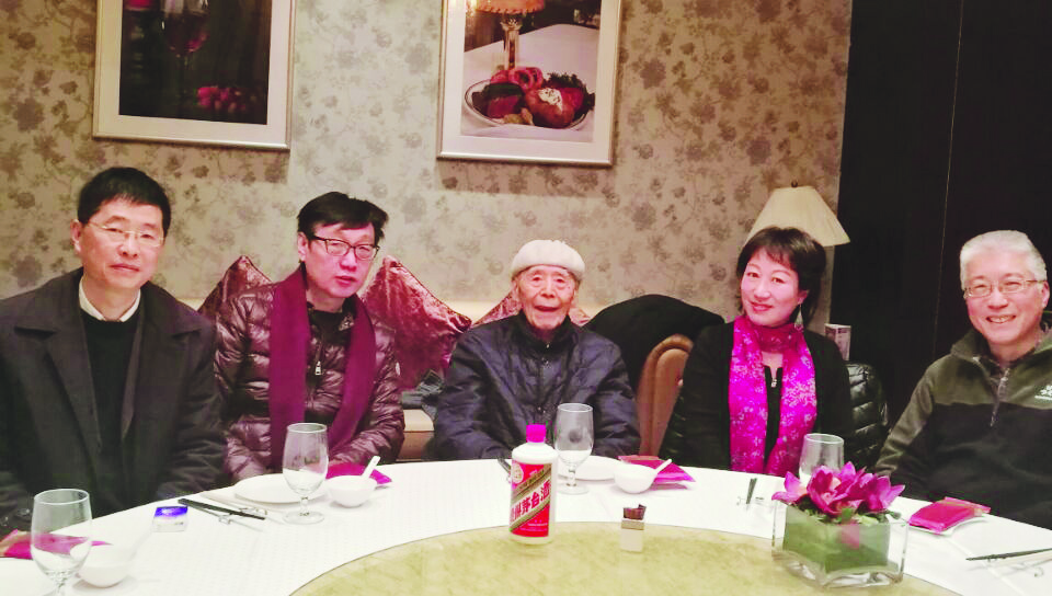 二〇一七年大年初一的團(tuán)聚,弟子許子?xùn)|(左二)、王曉明(右一)、楊揚(yáng)(左一)、王雪瑛(右二)等向錢(qián)谷融先生恭賀新春 圖片由作者提供