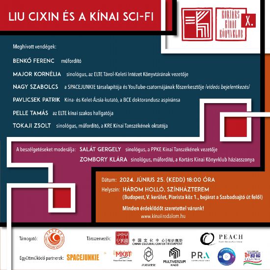 活動(dòng)分為上下兩場(chǎng),以“圓桌討論”形式舉行。上半場(chǎng)討論由俱樂部負(fù)責(zé)人、知名漢學(xué)家、翻譯家宗博莉·克拉拉女士(ZOMBORY Klára)主持,受邀嘉賓為羅蘭大學(xué)遠(yuǎn)東學(xué)院圖書館館長、漢學(xué)家馬約爾·柯爾奈莉奧女士(MAJOR Kornélia)和卡洛利·伽斯帕爾大學(xué)中文系講師、漢學(xué)家、翻譯家托考伊·若爾德(TOKAJI Zsolt)。下半場(chǎng)討論由帕茲馬尼·彼得大學(xué)中文系主任、漢學(xué)家邵萊特·蓋爾蓋伊(SALáT Gergely)主持,受邀嘉賓有文學(xué)翻譯本柯·費(fèi)倫茨(BENK? Ferenc)、中國和東亞問題學(xué)者、布達(dá)佩斯考文努斯大學(xué)博士生帕夫里切克·帕特利克(PAVLICSEK Patrik)和羅蘭大學(xué)中文專業(yè)學(xué)生佩萊·托馬什(PELLE Tamás)。