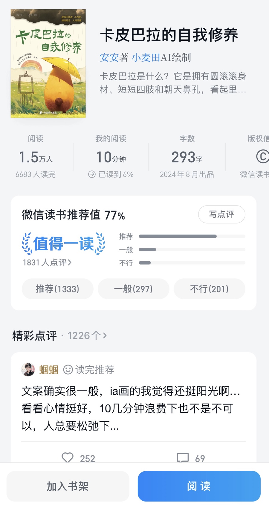 打開微信讀書中的《卡皮巴拉的自我修養(yǎng)》,目前顯示已有1.5萬(wàn)人閱讀,超過(guò)6600人讀完。這本8月上架的繪本,共293字,簡(jiǎn)介稱“希望通過(guò)可愛、松弛的水豚卡皮巴拉,為人們傳遞繁忙生活中的治愈與溫暖”。目前,在推薦欄,認(rèn)為其值得“推薦”的超過(guò)1300,“一般”的不到300,“不行”的評(píng)價(jià)剛剛超過(guò)200。
