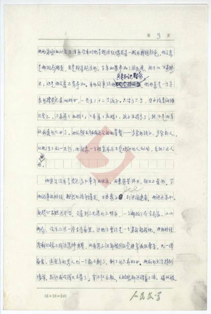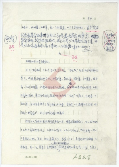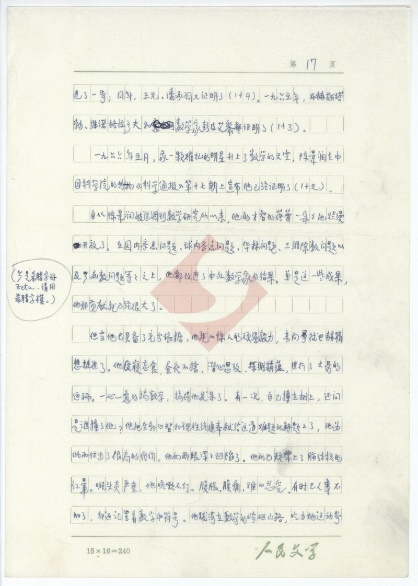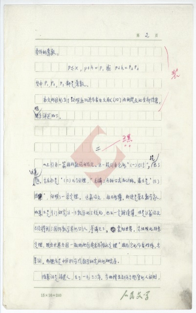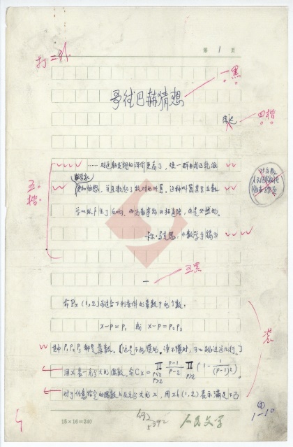 該稿共43頁(yè),作者用藍(lán)黑墨水在“人民文學(xué)15X16=240”的稿紙上進(jìn)行創(chuàng)作。每張手稿右上角均有頁(yè)碼標(biāo)識(shí),其中包括第1-37頁(yè),第39-44頁(yè)。不知什么原因,該稿并沒有第38頁(yè)。經(jīng)筆者細(xì)讀,并與《人民文學(xué)》上發(fā)表的《哥德巴赫猜想》對(duì)照,發(fā)現(xiàn)該稿第37頁(yè)與第39頁(yè)的內(nèi)容前后連貫,很有可能是作者將第38頁(yè)錯(cuò)標(biāo)為第39頁(yè)。