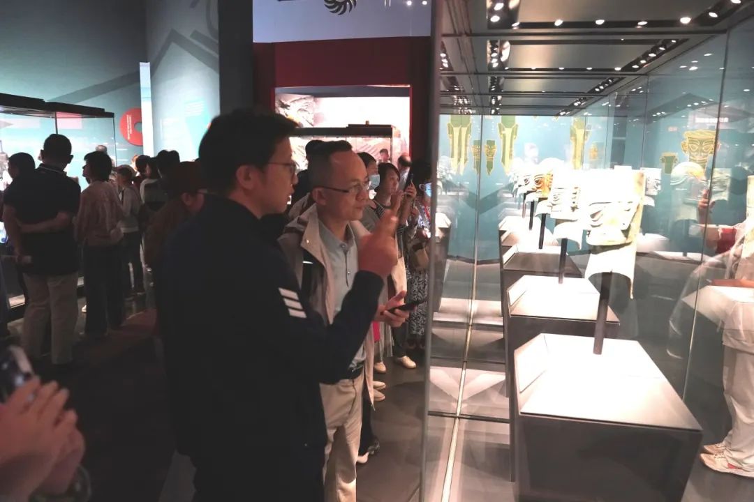 展廳入口處,一面花紋精致、紋樣復(fù)雜的古鏡狀電子顯示屏放映著三星堆與金沙文物的介紹片,青銅大力人、戴冠縱目青銅面具、黃金面具……這些造型奇特的文物不禁讓作家們對(duì)接下來的參觀充滿期待。展廳內(nèi)人頭攢動(dòng),每一件文物藏品前都圍滿了熱切求知的觀眾,作家們也加入其中,不時(shí)在文物前駐足細(xì)細(xì)觀賞,并拿起手機(jī)拍照記錄展品的精美。通過參觀,作家們逐步了解了三星堆與金沙文明的歷史背景和考古過程,收獲頗豐,感慨良多。