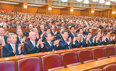 人民大會(huì)堂萬(wàn)人大禮堂華燈璀璨、氣氛喜慶。19時(shí)55分,在歡快的樂(lè)曲聲中,習(xí)近平等領(lǐng)導(dǎo)同志步入大禮堂,同少數(shù)民族代表、老同志代表親切握手,全場(chǎng)響起熱烈的掌聲。