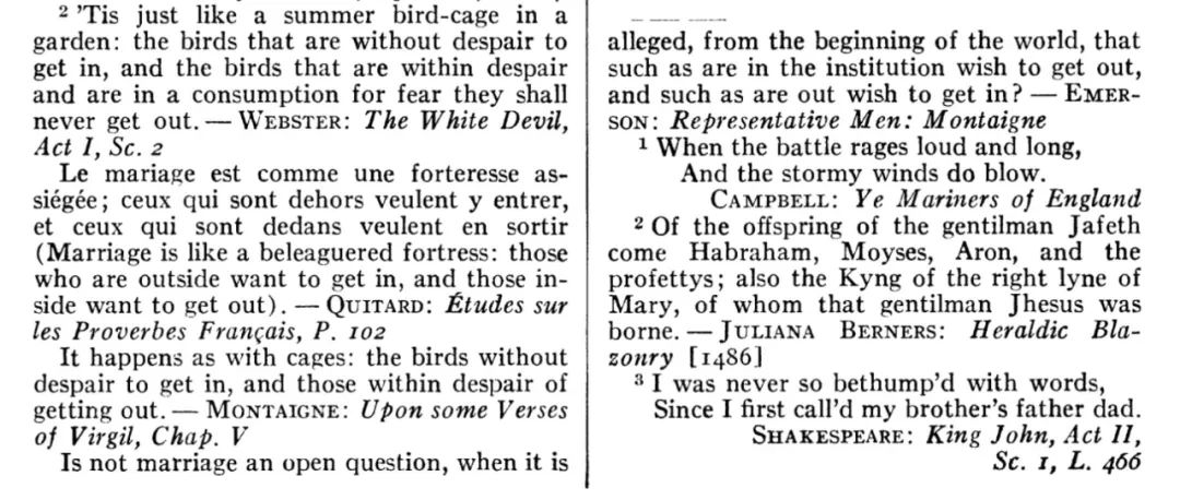 1937年問世的《巴特萊特引語辭典》第十一版里的一條長注,針對詩人約翰·戴維斯爵士的一段話,將婚姻比作節(jié)慶盛宴,參加的人想要離席,未能入席者卻想要加入。錢鍾書在寫《圍城》之前曾讀此書