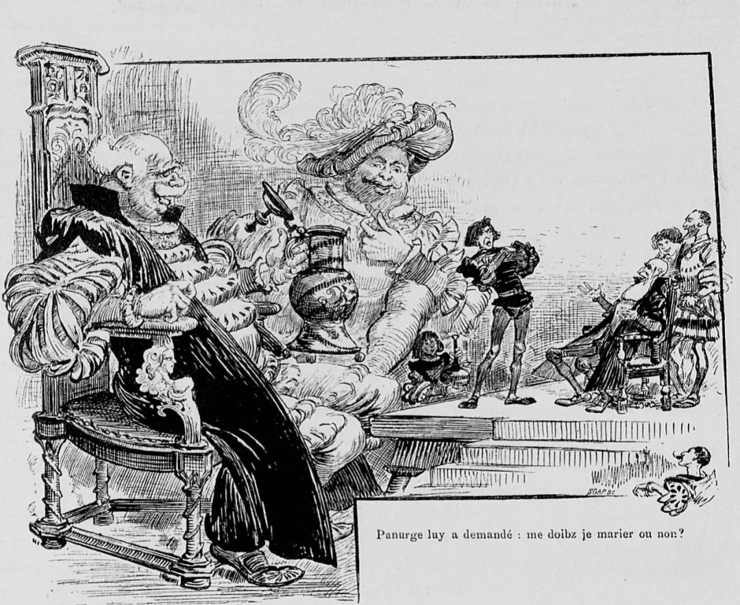 拉伯雷《巨人傳》第三卷第九章插圖(圖中文字為——巴奴日問龐大固埃:我是否應該結婚?)