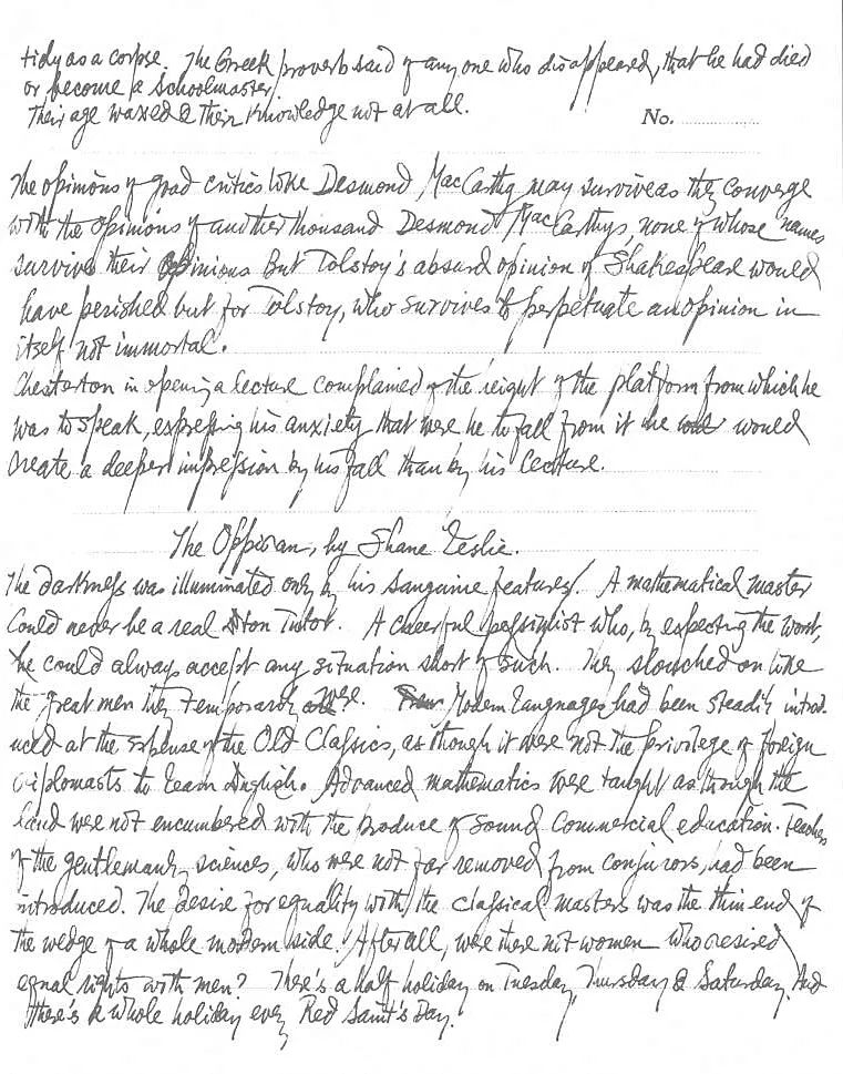 在晨光版單行本中,這句話后面附有拉丁文,后來版本又刪去了:Aut mortuus est aut docet litteras,這見于伊拉斯謨的《箴言錄》,是對希臘哲學家芝諾比烏斯《箴言集》第四組第十七條的譯述。原話背后的意思是羅馬帝國時代的雅典人不堪戰(zhàn)亂之苦,受制于征服者,許多囚犯到戰(zhàn)勝國去教人子弟讀書,偶有故人還鄉(xiāng),被問到親友現(xiàn)況,答曰:“不是死了,就是教書去了?!狈缎駚鎏峁┝肆硗庖粋€線索:《圍城》里的這句話也可能是從當代愛爾蘭作家肖恩·萊斯利(Shane Leslie,1885-1971)寫伊頓公學生活的自傳體小說中抄來,證據(jù)也是錢鍾書的讀書筆記。萊斯利小說就題作《城中人》(The Oppidan,1922),oppidan一般意思是“城鎮(zhèn)里的人”,首字母大寫就特指伊頓公學的寄宿學生。小說里描述過一位原本懷有政治理想、打算進國會的蘭姆先生,最終卻留在伊頓教古典語言。小說家說:“古希臘諺語曾說,什么人消失了,他不是死了,就是成了一個學堂先生?!边@段話只是英文,并不是伊拉斯謨的拉丁語譯文。此處更為強調(diào)現(xiàn)代學院體制造成知識分子的與世隔絕之感。而錢鍾書回國后的十年里,一直未能謀得大學里的穩(wěn)定教職,可以說是在“城中人”和“城外人”之間游離?!秶恰防锝衣读嗣撾x現(xiàn)實關懷而變得空疏無聊的高等教育模式,以及知識分子圈中頹唐卑瑣的精神世界,這種批判態(tài)度也正有賴于小說家本身游走于內(nèi)外的視角才得以成就。此外,《圍城》運用芝諾比烏斯這句話,與戰(zhàn)爭語境的結合更為緊密,更為深沉蘊藉地展現(xiàn)小說的現(xiàn)實主題。