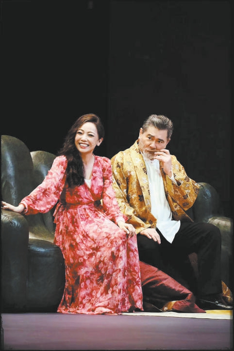 打磨人物,不僅要貼近人物的內(nèi)心,還要轉(zhuǎn)化生成一套獨特的表演語法,才能引發(fā)觀眾的震顫。《鱷魚》中的人物設(shè)計相當現(xiàn)代。角色固然有其姓名,但在稱呼上卻體現(xiàn)為復雜身份的交替,例如單無憚:一會兒是落馬失勢、人人喊打的“市長”,一會兒是家中掌權(quán)、威風凜凜的“老爺”,一會兒又是唯利是圖、眾叛親離的“舅舅”,如此微妙的心態(tài)變化,皆要演員下足功夫,琢磨人物的一舉一動。趙文瑄與鄧萃雯兩位演員,在人物口音塑造上花了不少心思。趙文瑄談吐論說時,既要保留那種拿腔作勢,又要有自詡為詩人的韻律感,所以必須格外注重每一句話的重音位置,才能使臺詞成為動作性的表達。鄧萃雯的“港普”暗示了人物復雜的身份經(jīng)歷,為了表現(xiàn)出瘦馬這一“情婦”角色獨有的悲涼感,她在形體表現(xiàn)上的婀娜多姿、風情萬種,也與語言上的牙尖嘴利、咄咄逼人形成反差,展現(xiàn)出了人物可氣與可悲的矛盾處境。