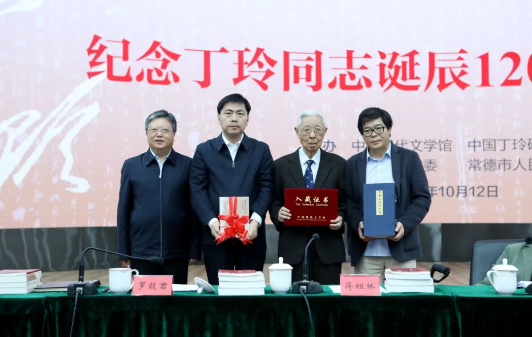 座談會現場還舉行了丁玲手稿展和圖書捐贈儀式。現場展出了丁玲人生不同階段的代表性照片,以及《建設新中國之文藝工作》《魯迅先生于我》《我所認識的瞿秋白同志》等珍貴手稿。蔣祖林、中國社科院文學所學者何吉賢、河北教育出版社黨委書記董素山共同向中國現代文學館捐贈了《丁玲作品精選集》,中國現代文學館常務副館長王軍接受捐贈并回贈入藏證書。