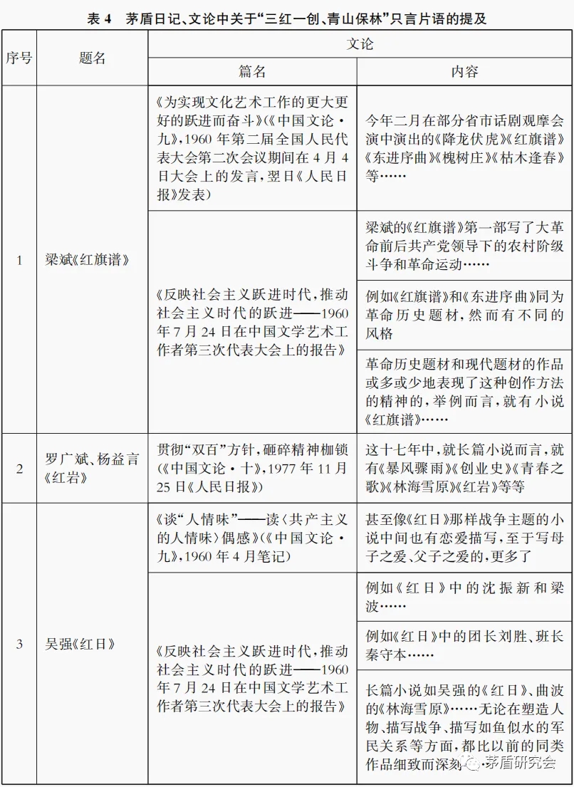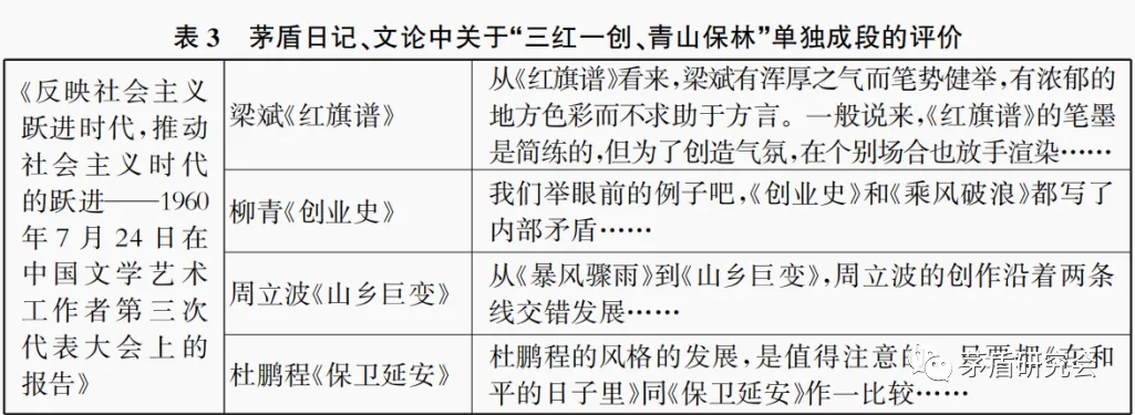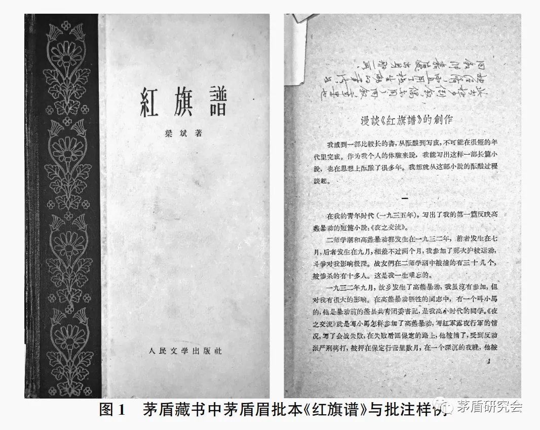 茅盾藏書(shū)中梁斌《紅旗譜》中的批注為初稿,《茅盾全集》中讀書(shū)筆記(1958年)根據(jù)茅盾未刊手稿情況刊發(fā),此手稿內(nèi)容與《紅旗譜》書(shū)中批注內(nèi)容構(gòu)成茅盾對(duì)《紅旗譜》評(píng)論觀點(diǎn)的文本,此文本在當(dāng)時(shí)并未公開(kāi)發(fā)表,此文本中的觀點(diǎn)在報(bào)告《反映社會(huì)主義躍進(jìn)時(shí)代,推動(dòng)社會(huì)主義時(shí)代的躍進(jìn)——1960年7月24日在中國(guó)文學(xué)藝術(shù)工作者第三次代表大會(huì)上的報(bào)告》中單獨(dú)成段關(guān)于《紅旗譜》單獨(dú)成段的評(píng)價(jià)觀點(diǎn)基本一致,并在此報(bào)告與報(bào)告《為實(shí)現(xiàn)文化藝術(shù)工作的更大更好的躍進(jìn)而奮斗》(《中國(guó)文論·九》,1960年第二屆全國(guó)人民代表大會(huì)第二次會(huì)議期間在4月4日大會(huì)上的發(fā)言,翌日《人民日?qǐng)?bào)》發(fā)表)中多次舉例提及。