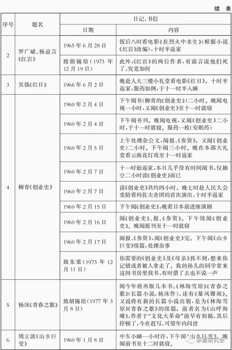 在日記中,茅盾觀看了《紅旗譜》話劇,以及電影《紅巖》《紅日》《林海雪原》,關(guān)于這些作品文本的閱讀則淹沒(méi)在了日記中“閱書(shū)”“閱書(shū)刊”之中。