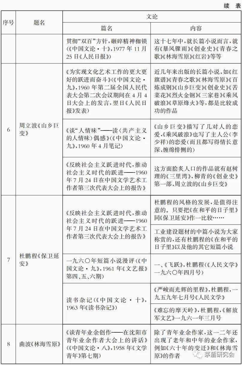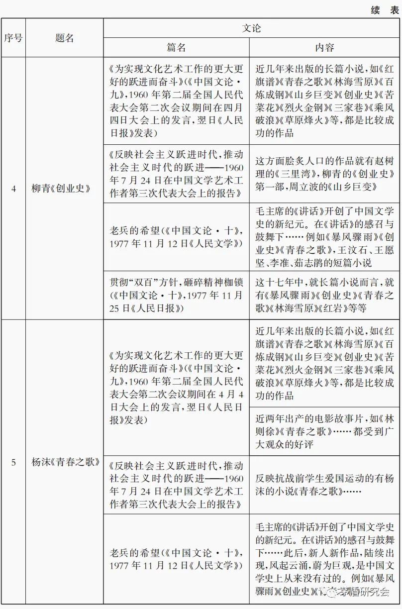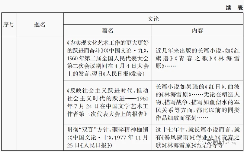 由表4可知,關(guān)于《紅巖》的提及是最少的,梁斌《紅旗譜》則較為頻繁,在一次報(bào)告中三次提及,關(guān)于曲波《林海雪原》提及時(shí)間跨度最長(zhǎng),最早在1958的《談青年業(yè)余創(chuàng)作——在沈陽(yáng)市青年業(yè)余作者大會(huì)上的講話》(《中國(guó)文論·八》,1958年《文學(xué)青年》第七期),最晚為1977年的《貫徹“雙百”方針,砸碎精神枷鎖》(《中國(guó)文論·十》,1977年11月25日《人民日?qǐng)?bào)》)。