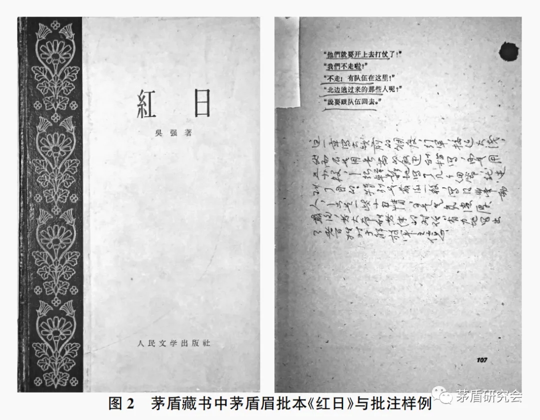 茅盾藏書(shū)中吳強(qiáng)的《紅日》中的批注為初稿,在《茅盾全集》中未收錄,系首次呈現(xiàn),批注中有關(guān)觀點(diǎn)內(nèi)容細(xì)節(jié)在《談“人情味”——讀<共產(chǎn)主義的人情味>偶感》(《中國(guó)文論·九》,1960年4月筆記)提及一次,在《反映社會(huì)主義躍進(jìn)時(shí)代,推動(dòng)社會(huì)主義時(shí)代的躍進(jìn)——1960年7月24日在中國(guó)文學(xué)藝術(shù)工作者第三次代表大會(huì)上的報(bào)告》三次提及,當(dāng)均為展開(kāi)論述,與書(shū)中批注內(nèi)容情況相一致。