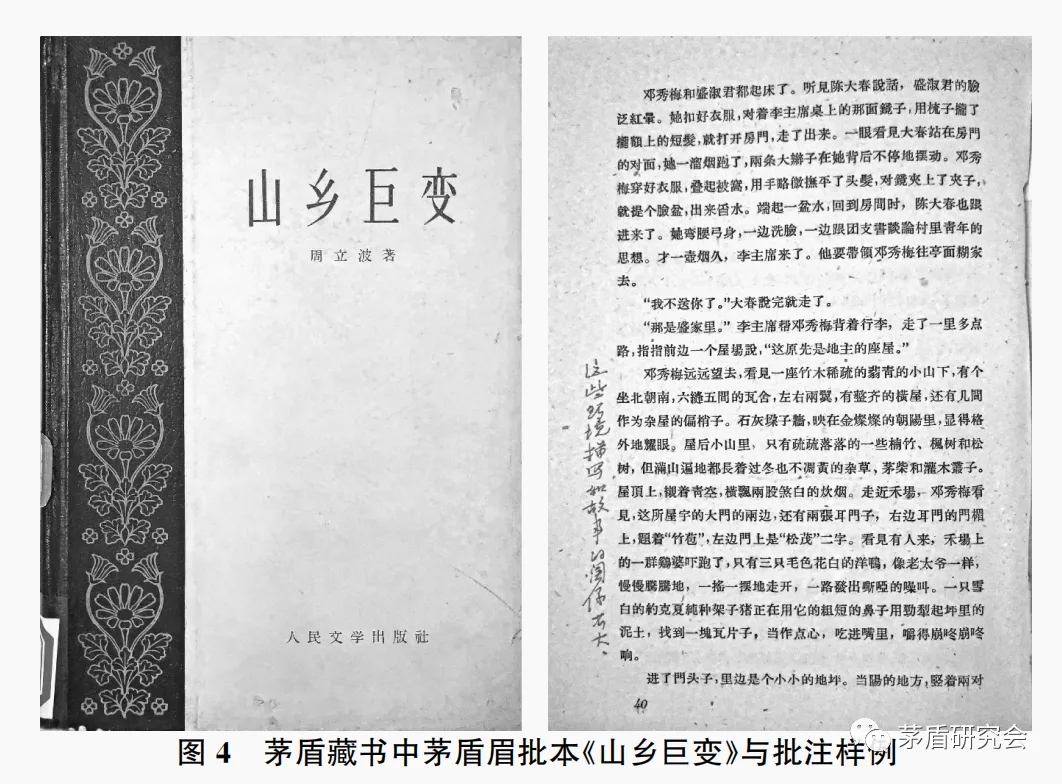 關(guān)于周立波《山鄉(xiāng)巨變》,在茅盾日記中5次出現(xiàn),1960年1月8日開(kāi)始閱讀,1月19日閱讀完畢,藏書(shū)中《山鄉(xiāng)巨變》有批注,在《反映社會(huì)主義躍進(jìn)時(shí)代,推動(dòng)社會(huì)主義時(shí)代的躍進(jìn)——1960年7月24日在中國(guó)文學(xué)藝術(shù)工作者第三次代表大會(huì)上的報(bào)告》中單獨(dú)成段評(píng)論《山鄉(xiāng)巨變》,在《為實(shí)現(xiàn)文化藝術(shù)工作的更大更好的躍進(jìn)而奮斗》(《中國(guó)文論·九》,1960年第二屆全國(guó)人民代表大會(huì)第二次會(huì)議期間在4月4日大會(huì)上的發(fā)言,翌日《人民日?qǐng)?bào)》發(fā)表)、《談“人情味”——讀<共產(chǎn)主義的人情味>偶感》《中國(guó)文論·九》,1960年4月筆記)、《反映社會(huì)主義躍進(jìn)時(shí)代,推動(dòng)社會(huì)主義時(shí)代的躍進(jìn)——1960年7月24日在中國(guó)文學(xué)藝術(shù)工作者第三次代表大會(huì)上的報(bào)告》三篇文論中均提及《山鄉(xiāng)巨變》。在致蕭三(1951年9月18日)與致沙汀(1978年8月2日)書(shū)信中提到周立波。