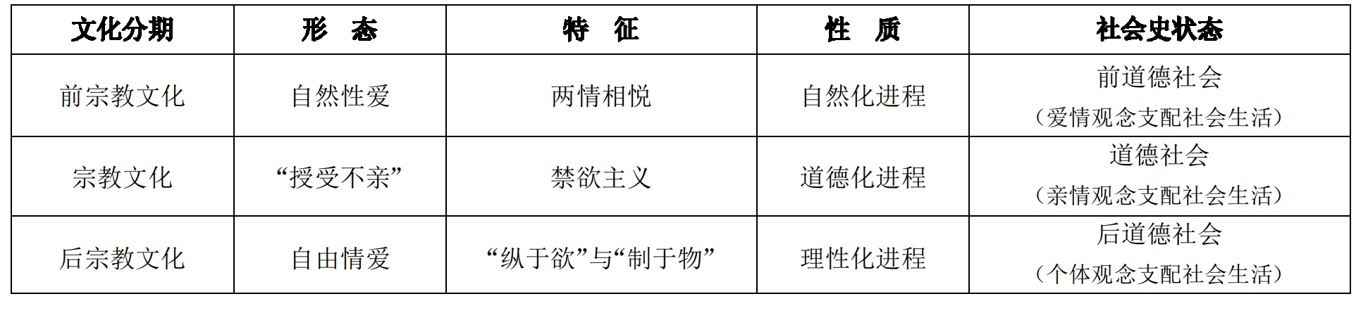 下表所列的是基于文化分期的情愛關(guān)系特征及其社會史狀態(tài):