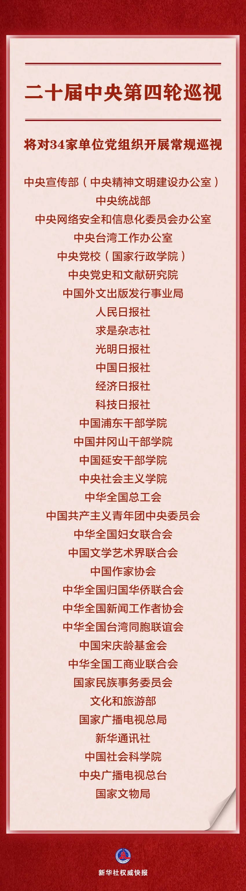 經(jīng)黨中央批準,二十屆中央第四輪巡視將對中央宣傳部(中央精神文明建設辦公室)、中央統(tǒng)戰(zhàn)部、中央網(wǎng)絡安全和信息化委員會辦公室、中央臺灣工作辦公室、中央黨校(國家行政學院)、中央黨史和文獻研究院、中國外文出版發(fā)行事業(yè)局、人民日報社、求是雜志社、光明日報社、中國日報社、經(jīng)濟日報社、科技日報社、中國浦東干部學院、中國井岡山干部學院、中國延安干部學院、中央社會主義學院、中華全國總工會、中國共產(chǎn)主義青年團中央委員會、中華全國婦女聯(lián)合會、中國文學藝術(shù)界聯(lián)合會、中國作家協(xié)會、中華全國歸國華僑聯(lián)合會、中華全國新聞工作者協(xié)會、中華全國臺灣同胞聯(lián)誼會、中國宋慶齡基金會、中華全國工商業(yè)聯(lián)合會、國家民族事務委員會、文化和旅游部、國家廣播電視總局、新華通訊社、中國社會科學院、中央廣播電視總臺、國家文物局等34家單位黨組織開展常規(guī)巡視。