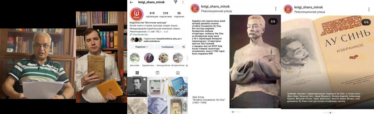 海外讀者反饋部分照片,其中左二是俄羅斯?jié)h學(xué)家羅季奧諾夫展示的1929年出版的俄文版魯迅作品,右二是白俄羅斯藝術(shù)家扎伊爾·阿茲古爾制作的魯迅雕像