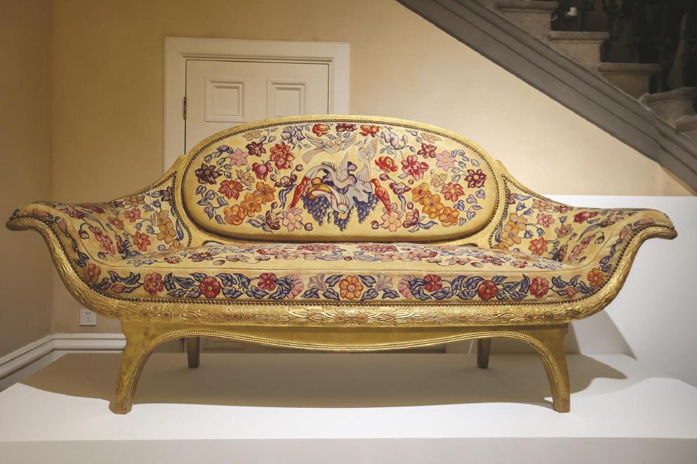 從大木箱中緩緩移出的一件金色歐式扶手椅,是其中一件,鎏金櫸木材質(zhì),包裹著絲絨面料,呈現(xiàn)出繁復(fù)的裝飾圖案,拉滿“潑天的富貴”感。這是法國(guó)國(guó)家家具管理館珍藏的“金鳥(niǎo)”系列家具之一,曾華美亮相1925年舉辦的巴黎國(guó)際裝飾藝術(shù)與現(xiàn)代工業(yè)博覽會(huì),集兩位藝術(shù)家的智慧結(jié)晶于一體。其木構(gòu)造型,由法國(guó)裝飾藝術(shù)家、室內(nèi)設(shè)計(jì)大師阿爾芒-阿爾貝·拉托完成,結(jié)合新古典主義元素與現(xiàn)代構(gòu)型,日后它也成為最具代表性的家具構(gòu)型之一。而其織錦部分,則由深受“納比派”和“野獸派”影響的法國(guó)畫(huà)家勒內(nèi)·皮奧繪制,由創(chuàng)立于1664年、曾為皇家掛毯織造機(jī)構(gòu)的博韋掛毯廠完成織造。在此次展覽中,觀眾不僅能見(jiàn)到這件“金鳥(niǎo)”系列的扶手椅,還將邂逅該系列的屏風(fēng)和兩把扶手椅。