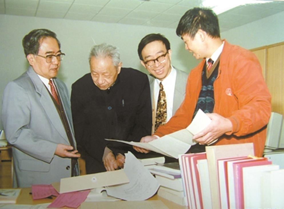 顧廷龍(左二)在指導(dǎo)“盛檔”整理工作。右一為馮金牛,右二為陳?ài)凭?,左一為本文作?/span>