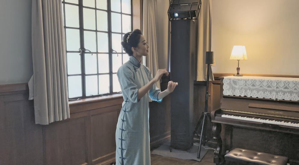 邁進夏衍舊居的馬蹄形門洞,夏衍的文字鋪滿前廳的天花板與主墻面,其所作《野草》的誦讀聲響起,這樣一道聲音景觀引人們進入一場輕巧別樣的沉浸式體驗??蛷d的留聲機中響起舞曲,一支《梧桐影韻》引用了上海老歌的流行曲風,詞曲卻是全新創(chuàng)作,講述了對這片充滿歷史記憶和音樂底蘊的城市街區(qū)的回憶。原來,這部作品由上海國際數字音樂周藝術總監(jiān)、作曲家,上海音樂學院安棟教授領銜擔綱創(chuàng)作,攜手上音數媒學院的戴維一副教授、董天晟,以及音工系房大磊副教授、音樂劇系的馬良導演、上海工程技術大學蔡張?zhí)A等青年教師共同主創(chuàng)。融合人工智能(AI)和擴展現實(XR)等前沿科技,將上海的城市文化記憶以全新的方式活態(tài)呈現。