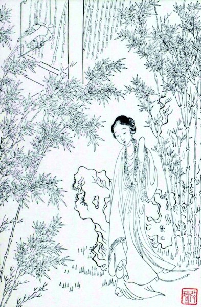清代畫家改琦的《紅樓夢圖詠》則更加注重作品的繪畫性與意境美?!盀t湘清韻”與“竹林風骨”使黛玉之美別具韻致,畫面中的林黛玉從瀟湘館竹徑中款款而來,一只手抬起,似拭淚之狀,另一只手隱在袖中,呈現(xiàn)弱柳扶風之態(tài),背景竹石筆墨簡逸。從線的造型來看,改琦筆下的線條輕細、秀潤、圓渾,內(nèi)力充盈,如行云流水,在動靜結(jié)合之中生動表現(xiàn)了林黛玉沉湎于自身情緒而又潔身自好的性格特征。