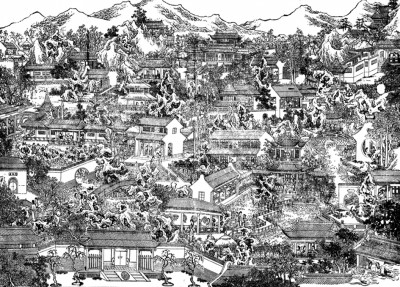 國畫大家潘天壽曾言:“吾國繪畫,以筆線為間架,故以線為骨?!眰鹘y(tǒng)中國畫的白描技法以線造型,通過線條的輕重緩急、疏密聚散、頓挫剛?cè)帷獾蓾袼茉炜臻g物象,有著很強的表現(xiàn)力。在眾多版本的《紅樓夢》中,《增評補圖石頭記》影響較大。其中,《增評補圖石頭記》萬有文庫版中的《大觀園總圖》采用白描技法繪制,圖中景物細密、元素齊備。在空間布局上,畫家采用了并置手法,將大觀園以建筑或主題景觀分割成若干子畫面,每個子畫面配置主題人物,以“畫中畫”的形式呈現(xiàn)出大觀園的整體架構(gòu)及主要景觀。從建筑組合到院落圍墻,從石景溪水到林木花草,透過細膩的筆觸,觀者可以感受到豐富的園林意蘊。畫家對每一處庭院結(jié)構(gòu)的刻畫均力求精準,透露出深厚的繪畫功底與園林造詣。