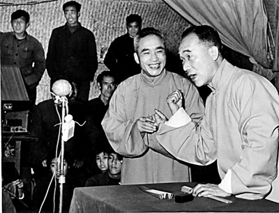 新中國成立后,相聲界對舊相聲進行了凈化語言、提升格調(diào)的革新整理。圖為侯寶林和郭全寶演出新相聲。圖片由中國曲協(xié)提供