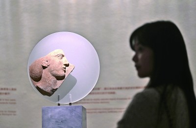 觀眾在觀看古希臘大理石女性頭像浮雕圓盤殘片。新華社發(fā)