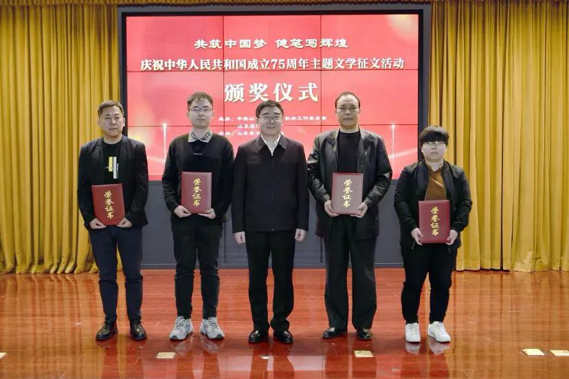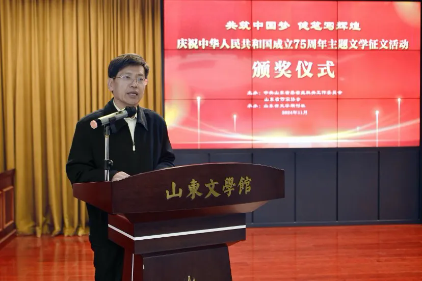 11月22日,由中共山東省委省直機(jī)關(guān)工作委員會、山東省作家協(xié)會主辦,山東省文學(xué)期刊社承辦的“共筑中國夢 健筆寫輝煌”慶祝中華人民共和國成立75周年主題文學(xué)征文活動頒獎儀式在山東省作家協(xié)會一樓多功能廳隆重舉行。山東省作協(xié)黨組書記、副主席趙藝丁,省作協(xié)黨組成員、副主席陳文東,省委宣傳部文藝處處長尹永海,省作協(xié)副主席、《山東文學(xué)》主編劉玉棟出席頒獎儀式并為獲獎作者頒獎,來自全省各地的20余位獲獎作者代表和省作協(xié)部分干部職工參加活動。