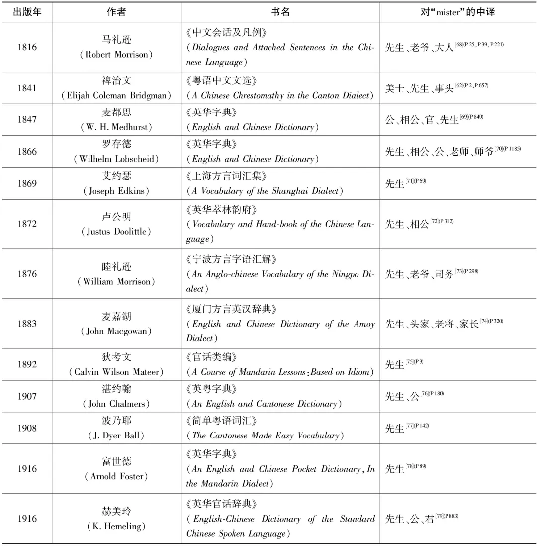 表1 19世紀(jì)初至20世紀(jì)初中英辭典和教科書(shū)中對(duì)“mister”的中譯