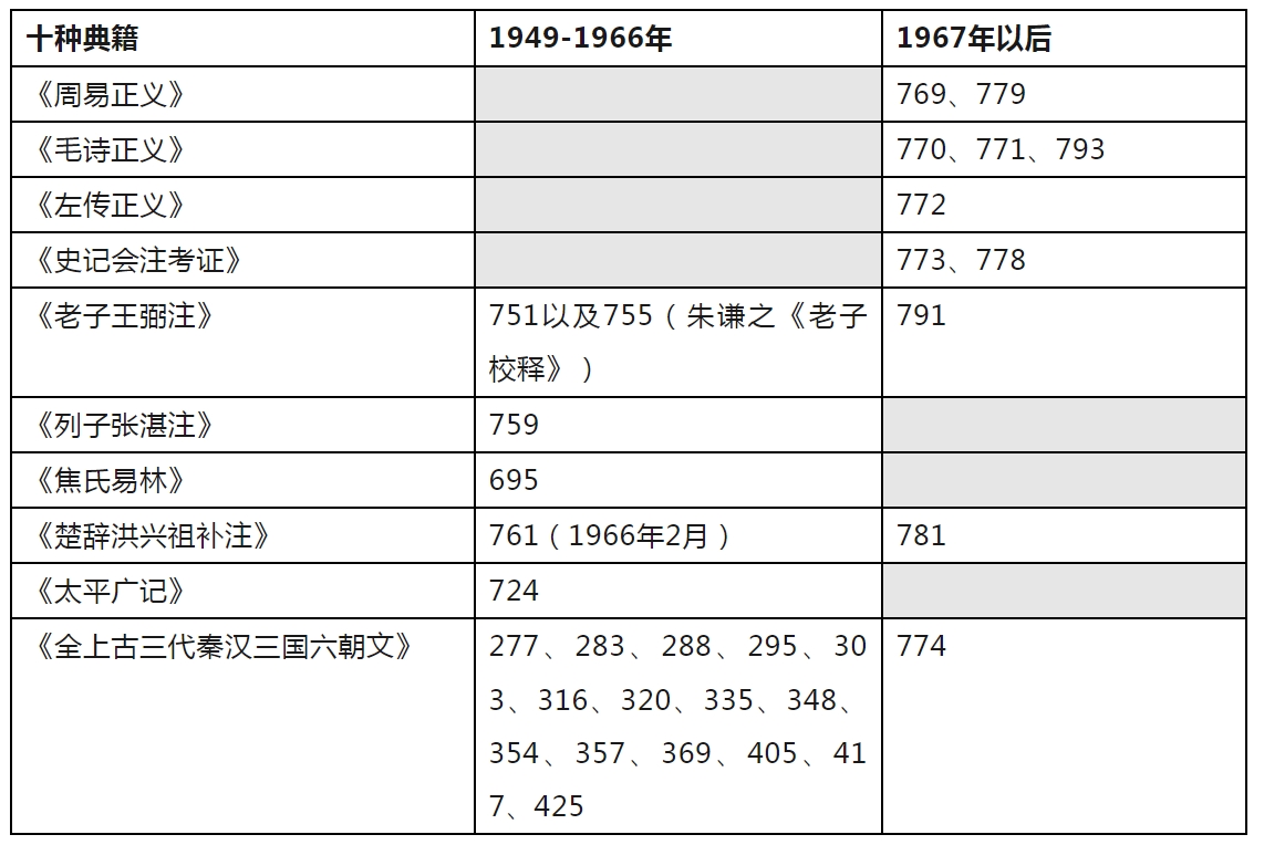 在提出新見解和對舊說進行增補訂正的過程中,錢鍾書逐漸產(chǎn)生了新的著述想法,就是指1972年3月他從河南干校返回北京后動筆、1979年8月后陸續(xù)出版的《管錐編》這部龐大著作。從該書所涉及十種樞紐性質(zhì)的經(jīng)典看,《容安館札記》皆有其草稿,可以下表說明: