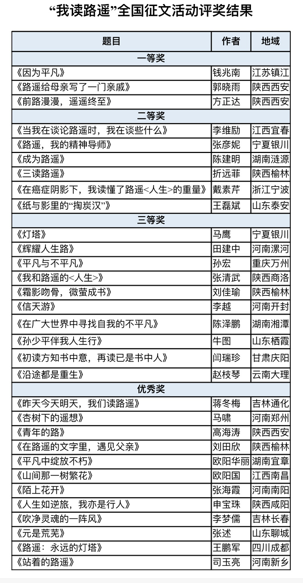 “我讀路遙”全國征文活動9月14日啟動,10月31日截止,共收到近5000篇來稿。作者來自全國各省區(qū)市,涵蓋老、中、青、少各個年齡段。他們從事多種職業(yè),有基層作家、教師、醫(yī)生、軍人、學(xué)生、保姆、保潔員、快遞員、網(wǎng)約車司機等。他們用散文、散文詩、賦等各種文體,表達閱讀路遙作品的真情實感。該征文活動評審程序嚴格,實行匿名評審。中國作協(xié)副主席閻晶明擔(dān)任評委會主任,李洱、李曉東、王登渤、徐坤、張莉、楊海蒂等專家擔(dān)任終評委,最終評選出一等獎3篇、二等獎6篇、三等獎10篇、優(yōu)秀獎12篇。