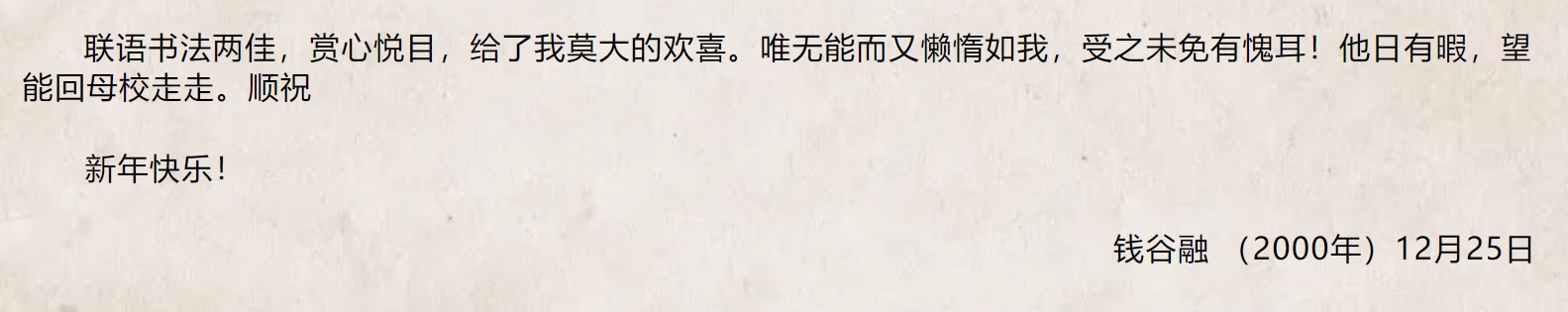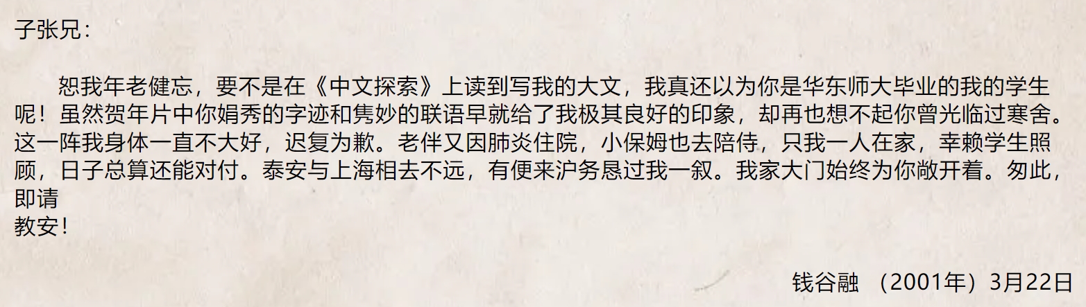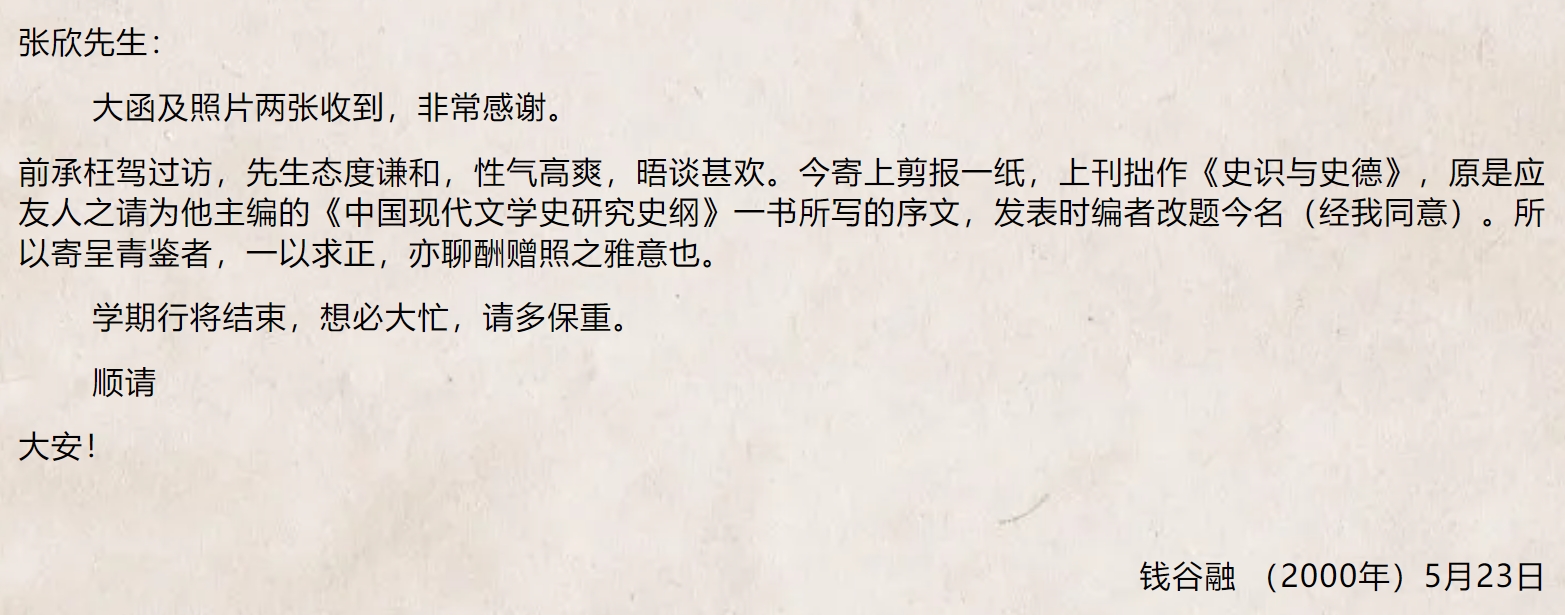 很快就又收到錢先生復信,而且這次復信的用語、措辭,特別是所表達的心意更讓我感覺溫暖,我們的距離似乎進一步拉近。也許是我寫的訪問記讓他回想起一年前的我,也許是覺得我的文字還算誠實本分,因而也就對我增添了一份信任。此信是這樣寫的: