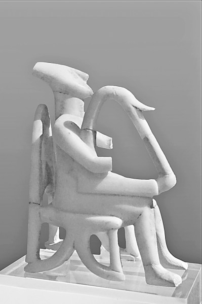 提琴形雕塑是基克拉澤斯文化初期(約公元前3200年至公元前2700年)最具特色的作品,這些雕塑實(shí)際上表現(xiàn)的是坐在地上的女性,因其體態(tài)如同小提琴而被考古學(xué)家們?nèi)绱嗣?。雖然也有其他形狀的雕像和大理石碗等文物被發(fā)現(xiàn),但用提琴狀坐姿表現(xiàn)女性的小雕像是這一時(shí)期文化最重要的表現(xiàn)形式。這些小雕像十分抽象,充滿了自然主義風(fēng)格。在這一時(shí)期,很少發(fā)現(xiàn)人類集中居住的定居點(diǎn),這些雕像大多從單獨(dú)或小型墓葬群中被發(fā)現(xiàn),有些雕像上還有被修補(bǔ)過的痕跡,說明曾被使用過較長(zhǎng)的時(shí)間。由此,有考古人員認(rèn)為這些雕像很可能是用于宗教性質(zhì)的活動(dòng)?;死瓭伤谷苏J(rèn)為人去世后會(huì)到另一個(gè)世界生活,這些小雕像很可能是連結(jié)生與死兩個(gè)不同世界的器物。