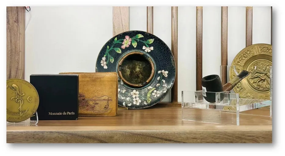 最有名的當然是煙斗,可以說是王瑤的一個符號,但仔細看看,其實沒太用過。這類煙斗在專檔中還有幾個,算得上是一項收藏,都是九成新。另一件掐絲琺瑯煙碟卻是真用過的,其中可以見得“水深火熱”并非虛言。碟口略向內(nèi)扣,作為煙灰缸似乎不甚合理,直到借展時,里面還有煙灰,這是一個很奇妙的感覺。