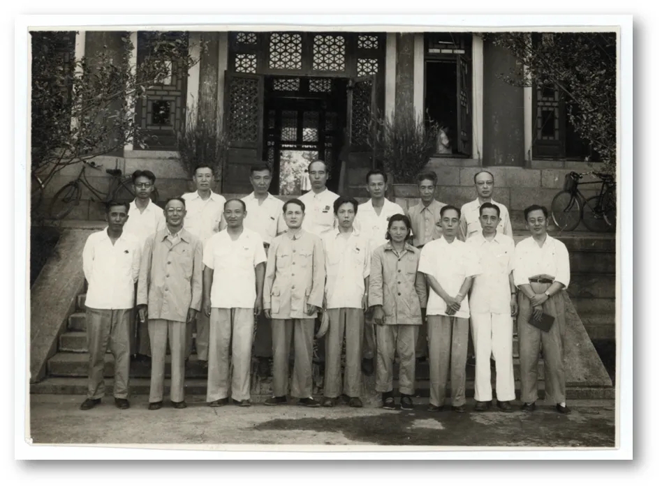 另一份有意思的照片是一張合照,拍攝于北京大學,照片上有二十余人。這是布展中偶然發(fā)現(xiàn)的材料,當時需要展覽王瑤和李何林一同出鏡的照片,遂翻到了這一張。之所以說“有意思”,是因為李何林不是北大系統(tǒng)的人,不太有機會出現(xiàn)在北大。那么,這就不是北大教職工日?;顒拥暮嫌?,而是會議留念。有這樣一個會議嗎?循北大、李何林、王瑤的關(guān)鍵詞查去,發(fā)現(xiàn)了何善周先生的回憶,這個會議,很可能就是學科史上頗為關(guān)鍵的“綜合大學現(xiàn)代文學史教學大綱討論會”。何善周所列舉的與會者,很多人確實都在照片上,包括余上沅、吳組緗、孫中田、陳瘦竹、此后不久便離世的劉綬松,以及作者何善周本人。