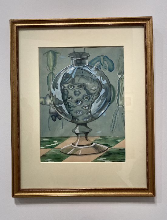 展覽展出的二百五十件作品涵蓋了繪畫、電影、攝影以及重要文獻。畫作中有來自世界各大美術(shù)館藏品中超現(xiàn)實主義畫派代表人物的知名作品,比如達利的油畫《偉大自慰者的臉龐》(Visage du grand masturbateur, 1929),瑪格麗特的《個人價值》(Les valeurs personnelles, 1952), 意大利畫家喬治·德·基里科(Giorgio de Chirico, 1888-1978)的《孩子的大腦》(Le cerveau de l’enfant, 1914) 與《愛之歌》(Le Chant d’amour, 1914), 德國畫家馬克斯·恩斯特(Max Ernst, 1891-1976)的《大森林》(Le grand forêt, 1927),米羅(Joan Miró, 1893-1983)的知名畫作《吠月之犬》(Chien aboyant à la lune, 1926)。除了這些明星藝術(shù)家之外,在本次展覽中能看到更多超現(xiàn)實主義派女藝術(shù)家的作品。其中有一些已小有名聲:朵拉·瑪爾,攝影家李·米勒(Lee Miller, 1907-1977),英國女畫家利奧諾拉·卡林頓(Leonora Carrington, 1917-2011), 法國先鋒攝影家克勞德·卡恩(Claude Cahun, 1894-1954), 德國藝術(shù)家梅拉·奧本海姆(Meret Oppenheim, 1913-1985),以及捷克超現(xiàn)實主義團體創(chuàng)始人及代表性人物女畫家托伊恩(Toyen, 1902-1980)。另一些至今依然鮮為大眾所知的女藝術(shù)家的作品也得到了呈現(xiàn),比如英國超現(xiàn)實主義先鋒畫家伊賽爾·科爾庫洪(Ithell Colquhoun, 1906-1988),法籍匈牙利畫家朱迪特·雷格爾(Judit Reigl, 1923-2020), 意大利畫家萊昂諾爾·菲妮(Leonor Fini, 1907-1996), 墨西哥西班牙裔畫家瑞梅迪奧斯·瓦羅(Remedios Varo, 1908-1963), 美國超現(xiàn)實主義派女畫家海倫·倫德伯格(Helen Lundeberg, 1908-1999), 加拿大魁北克藝術(shù)家米米·帕倫特 (Mimi Parent,1924-2005),法國藝術(shù)家亞內(nèi)·勒·圖梅蘭(Yahne Le Toumelin,1903-2023), 英國藝術(shù)家及精神學家格蕾絲·帕爾索普(Grace Pailthorpe, 1883-1971),還有難得一見法籍埃及詩人喬伊斯·曼蘇爾(Joyce Mansour, 1928-1986)……