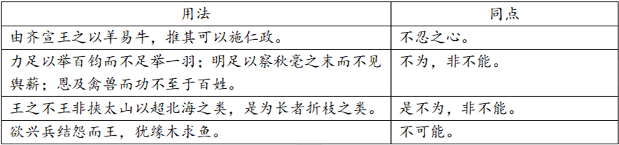 論述齊宣王之“不王”是不為而非不能。孟子舉有人能“舉百鈞”而不能“舉一羽”,能“察秋毫”而不能“見輿薪”為例,說明“不為也,非不能也”的道路。齊宣王還不能理解,于是孟子又舉“挾泰山以超北?!迸c“為長者折枝”為例進一步說明。兩問兩答,兩次取譬,同時進行反詰,詞鋒犀利,使對方明確“不王”的癥結所在。